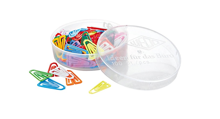 Plast papirclips polystyrol i ass. farver. Leveres i hård plastæske med låg med 100 stk.