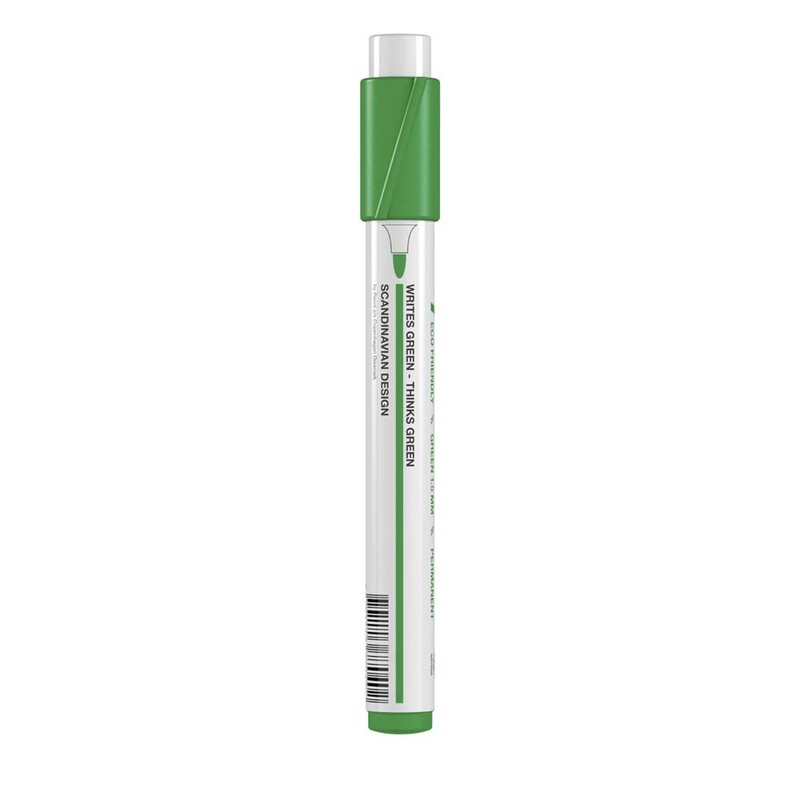 Markeren har permanent og hurtigttørrende blæk, samt et hylster i aluminium. Write green, think green..
