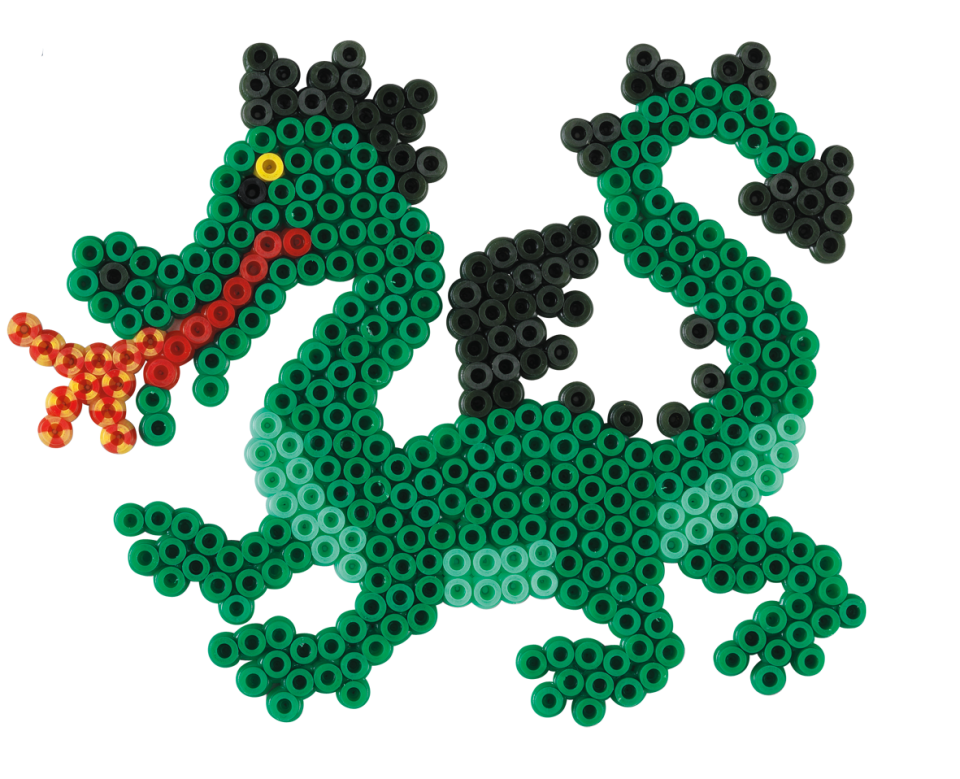 Ca. 4.000 perler, 2 stiftplader: Stor firkantet nr. 234 og drage nr. 305. Motivark, vejledning og strygepapir