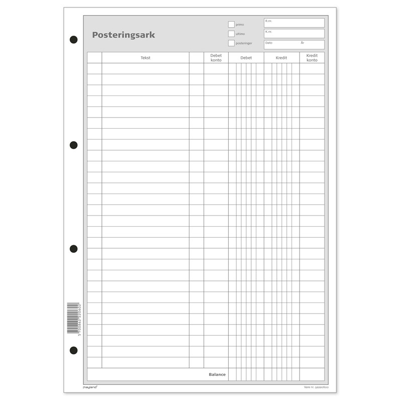 Praktisk og letanvendelig posterings-/bogføringsblok. 100 ark. m/4 huller.