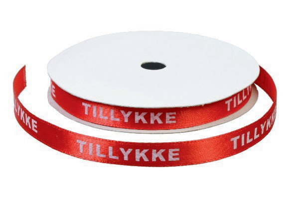 Satinbånd “Tillykke” 9 mm. hvid/rød
