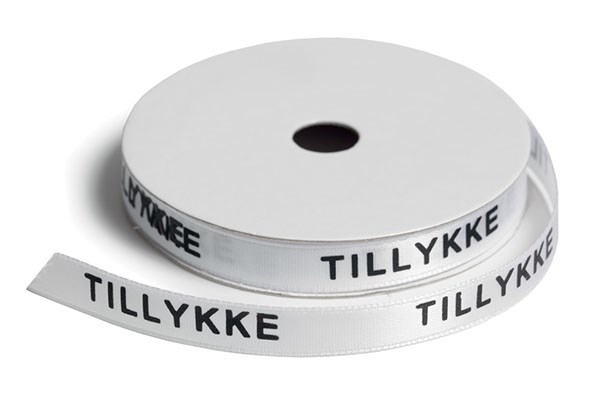 Satinbånd “Tillykke” 9 mm. hvid/sort
