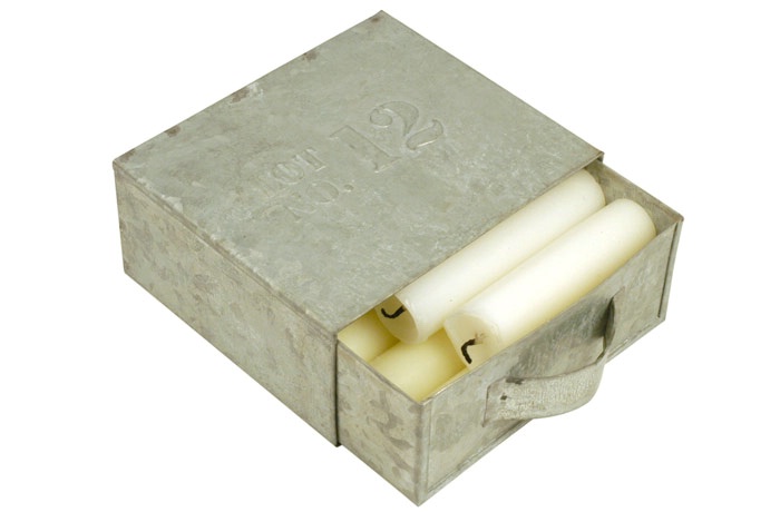Lille zinkskuffe med teksten “Lot no. 12” Passer til alm. str. små stearinlys. (Excl. lys)