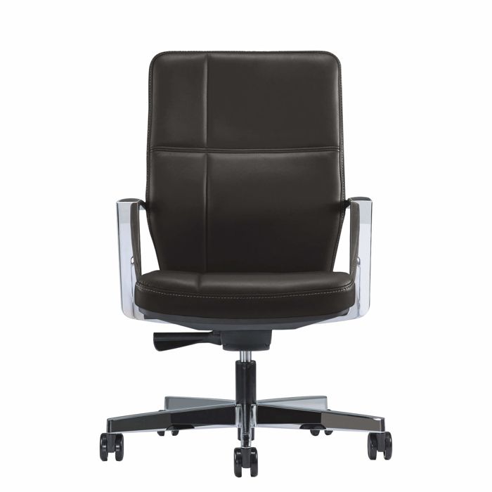 Sonoma er en fantastisk komfortabel stol. Den er fyldt med PU skum, som gør den ekstremt behagelig at sidde på – også i de lange arbejdsdage. Ergonomiske indstillinger Sonoma har justerbar lændestøtte, sædedybdejustering (6 cm) og vægtjusterbart synkronvip, 0° til 20°, der let låses i 4 positioner. Når du læner dig tilbage, justeres mekanismen sig automatisk efter vægten. Inkl. aluminiumsarmlæn og fodkryds i 100 % genanvendeligt materiale. Med sorte hjul i Ø6 cm. Chefstol Sonoma er med følgende funktioner: Justerbar lændestøtte så støtten kan tilpasses din rygs svaj. Synkronmekanisme som vipper sæde og ryg sammen i et ergonomisk godt forhold. Sædedybdejustering som sikrer bedst mulig støtte under baglårene. Designdetaljer og miljøhensyn Betrukket med læder både for og bag for ekstra eksklusivitet. Det sofistikerede design er fuldendt på denne stol. Bemærk de flotte cremefarvede syninger på ryggen og sædets kanter – en flot kontrast til det ægte sorte læder på slidfladerne. Se også kanalsyningerne på ryggen og sædet. De elegante armlæn svinger rundt om ryglænet. De har en beklædt top så det blanke metal ikke føles koldt på underarmen. Meget af Sonoma er 100% genbrugeligt. Det gælder bl.a. sæde- og rygskallerne i polypropylen, samt armlæn og fodkryds i aluminium. Specifikationer: Stoftype: ægte læder. Siddehøjde: 40-50 cm. Rygtype: medium (57 cm.) Armlæn: inklusive Sædedybde: 40-46 cm. Sædebredde: 49 cm. Total bredde: 59 cm. (armlæn) / 70 cm. (fodkryds) Højde fra top af sæde til top af armlæn: 21 cm. Max belastning: 130 kg.