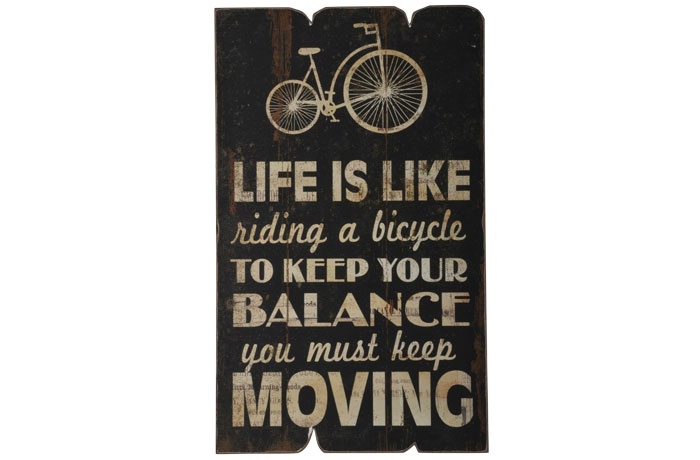 Træskilt “Live is like riding a bicycle to keep your balance you must keep moving”