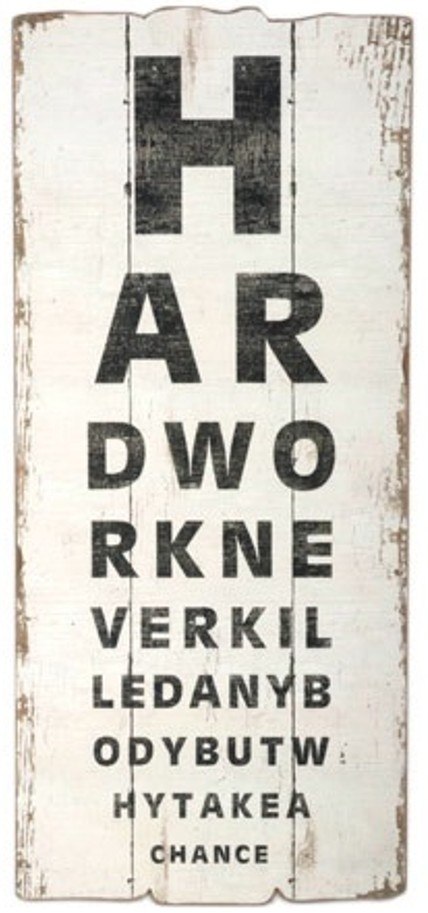Stor flot træskilt i stil med øjenlægens. Bogstaverne danner teksten “Hard work never killed anybody, but why take a chance”