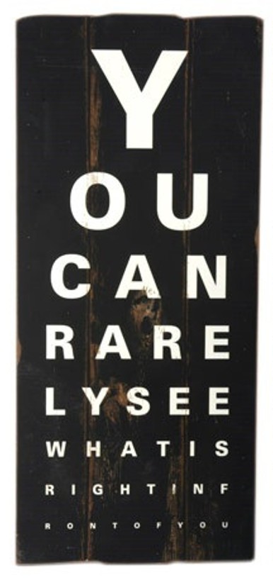 Stor flot træskilt i stil med øjenlægens. Bogstaverne danner teksten “You can rarely see what is right in front of you” Mål: Længde: 30 cm. Bredde: 3 cm. Højde: 67 cm.