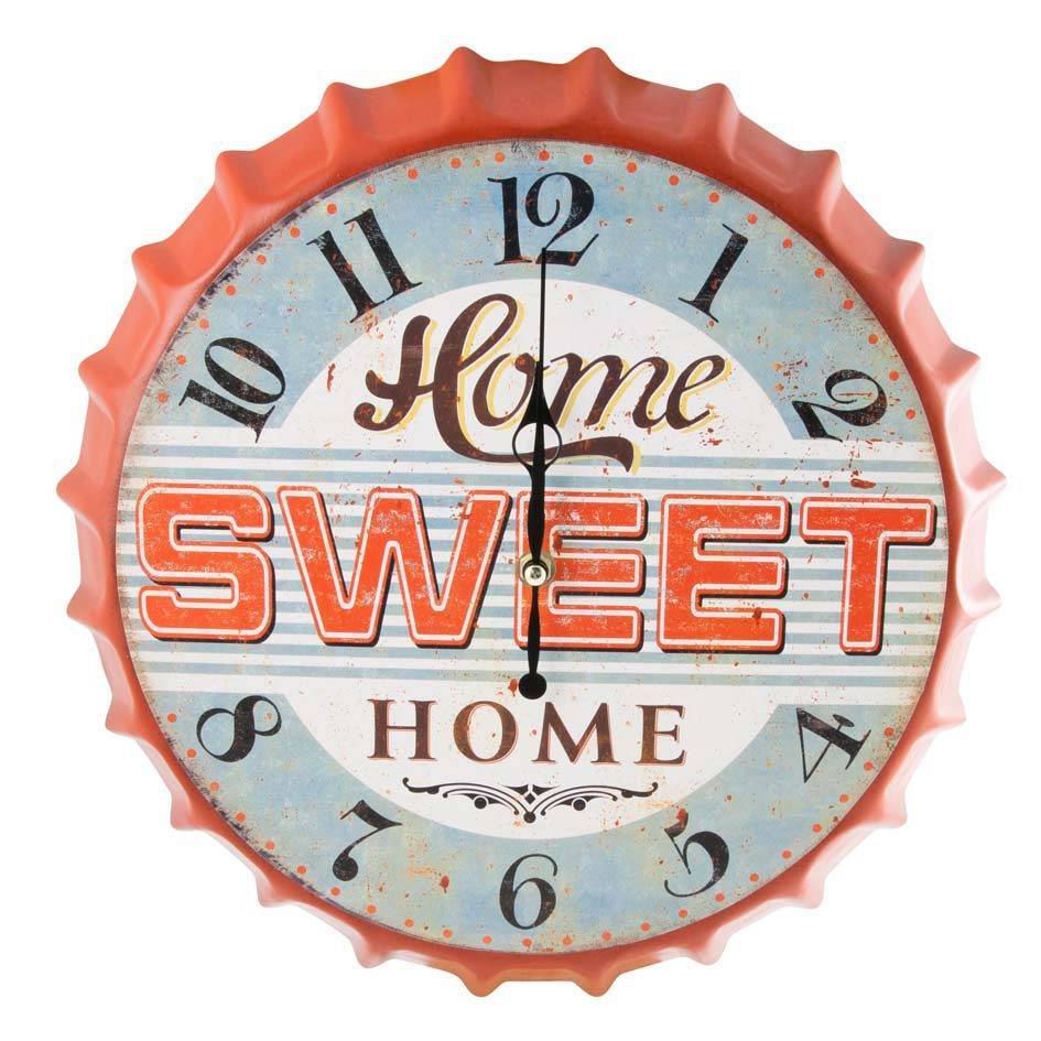 Stort vægur formet som metalkapsel Home Sweet Home . Mål: Ø34 cm.